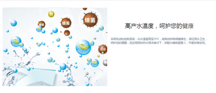 出水溫度高達(dá)70℃,有效抑制細(xì)菌孽生,保證用水衛(wèi)生。即開即熱,熱水供應(yīng)迅速。水溫恒定,熱水恒溫專家。